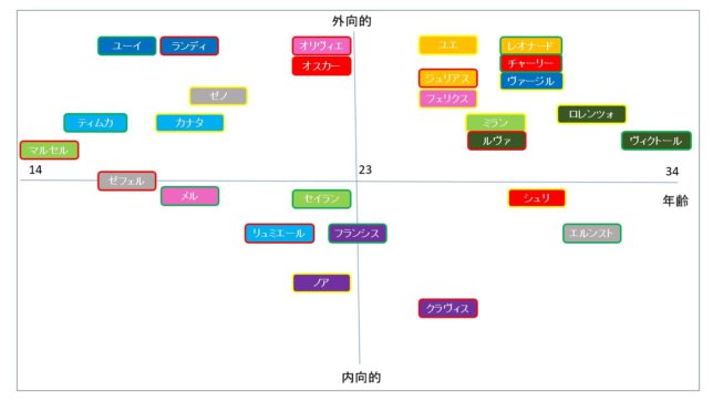 上図で、同サクリアの守護聖たちが近くにプロットされている場合は、守護聖間での役割/ポジショニングが似ているものと考えられます。年齢が比較的高く、外向的なゾーンにプロットされている光と地、年齢としては真ん中辺りで、内向型にプロットされている闇がそれに該当しますので、ユエとノア、そしてロレンツォについては、これまでの光、地、闇の守護聖のポジショニングと基本的には似たもので、メチャクチャ大きく逸脱することはなさそうに思います。