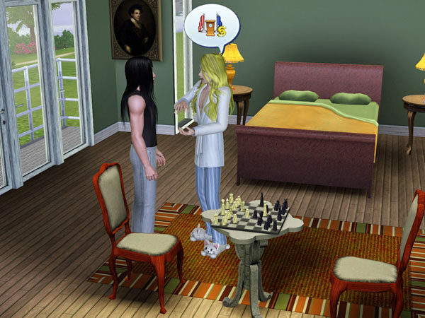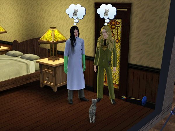 ブリッジポート在住時のLv10 政治家ジュリ様&Lv10 外科医クラ様(それぞれキャリアレベルMAX)が、仕事から同時に帰宅するなり、ネコ *に* まっしぐらの図(二人が吹き出しから出しているのはネコ)。