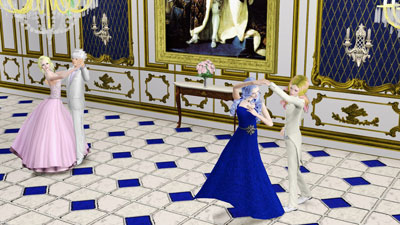 「舞踏会」の情報が出たときにもまたテンション上がって、速攻で作ったエセ舞踏会。テーマは、社交ダンスなんて全く経験なく、緊張感MAXでコチコチのゼフェリモに対して、流れるような動きに誰もが目を奪われる優雅なヴィエロザ(のつもり)。前回の貧乏くさいロビーで反省したので、一応ホールの内装も凝ってみた。実際のゲームで、こんな感じで見られたらいいなーという妄想大爆発。しかし実際は(ry